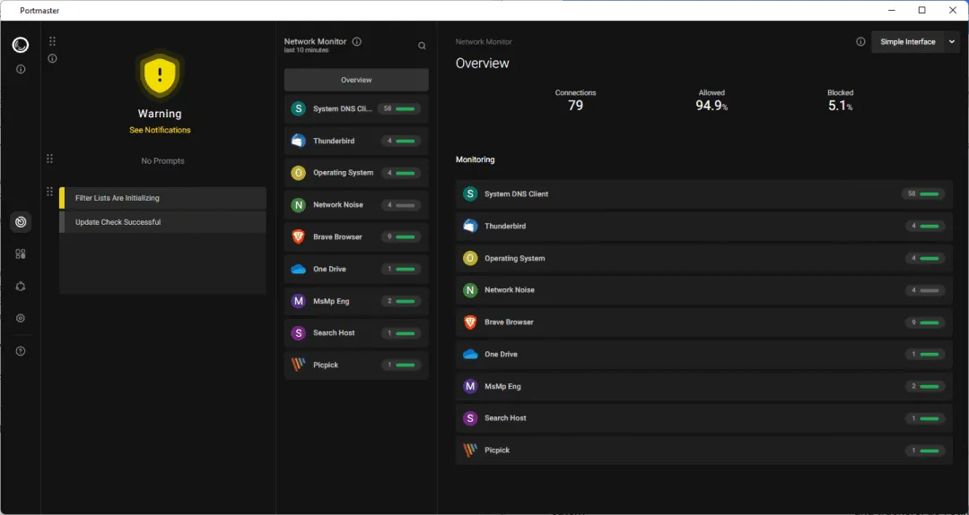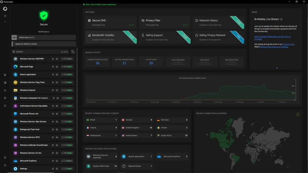 第一次打开 Portmaster,你会被它的界面惊艳到。深色的仪表盘上,左侧列出了所有正在联网的应用程序,右侧则是实时的连接详情。
