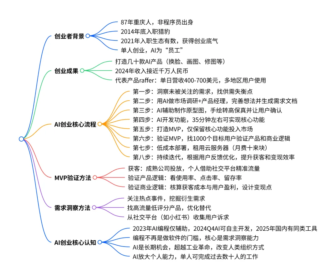 一位87 年重庆籍的非程序员创业者,曾任职猎豹、生态有数,凭借AI 工具单枪匹马创业,打造出表情包换脸、AI 画图等几十款产品,2024 年年收入接近一千万人民币;其核心创业逻辑是先洞察未被关注的需求,借助 AI 完成市场调研、产品设计、原型制作、功能开发等全流程,打造MVP 最小可行产品并通过社交平台低成本验证,再持续迭代优化,核心门槛并非编程而是需求洞察能力,而 AI 作为长期机会,能极度放大个人能力,让单人完成过去数十人的工作。