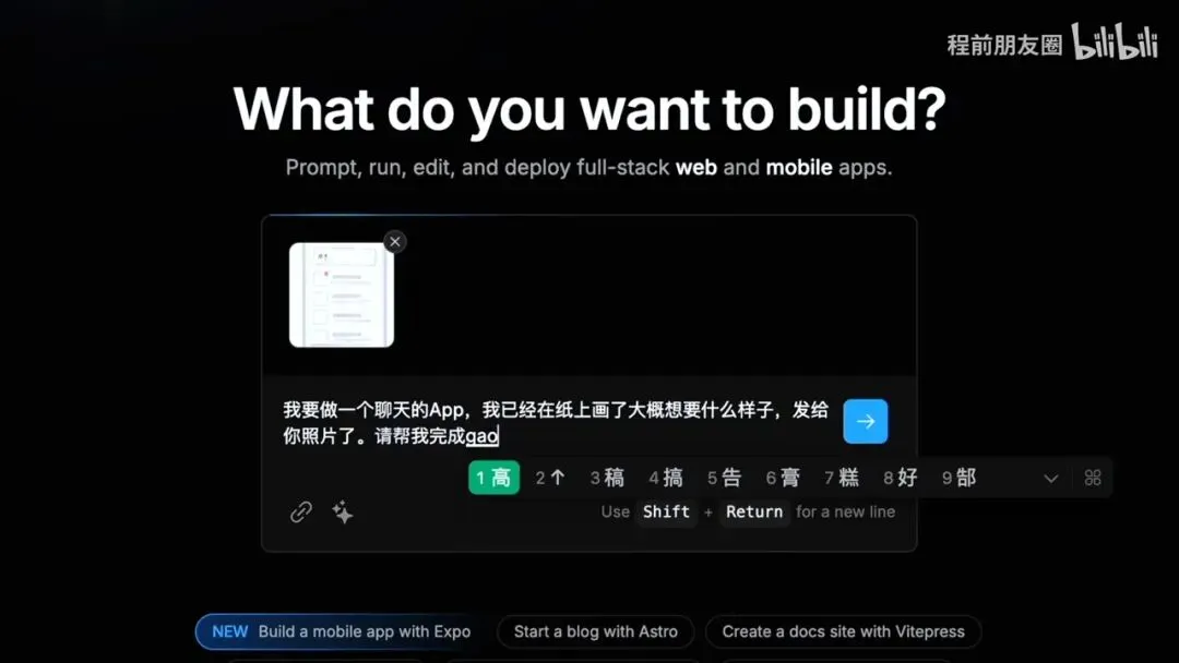 向 AI 描述功能需求(支持中文),AI 会拆解任务、推荐技术框架,约 35 分钟即可实现核心功能,快速打造产品; - 打造 MVP 最小可行产品