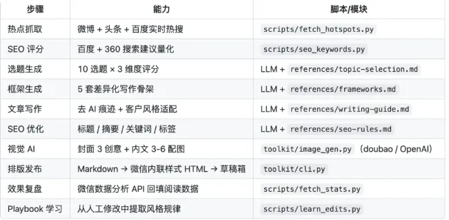 GitHub 上 300+ star,功能列表看得人流口水——热点抓取、选题评分、7 层去 AI 痕迹、自动排版推送草稿箱。一套流程跑下来,公众号文章从 0 到发布,一句话搞定。