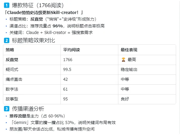 现在标题设计会优先应用 playbook 里的标题规则——反直觉策略、疑问式公式,都是基于数据复盘总结出来的。