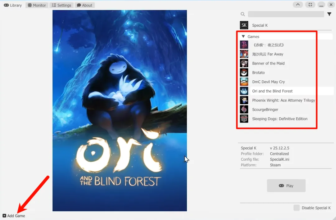 软件为傻瓜式安装萌哥这里就不演示了,打开后会自动识别到Steam、EPIC等各大平台的游戏,学习版的游戏,也可以点击左下角添加按钮