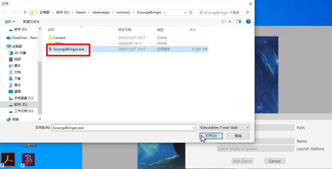 找到游戏对应目录,选中exe文件进行添加