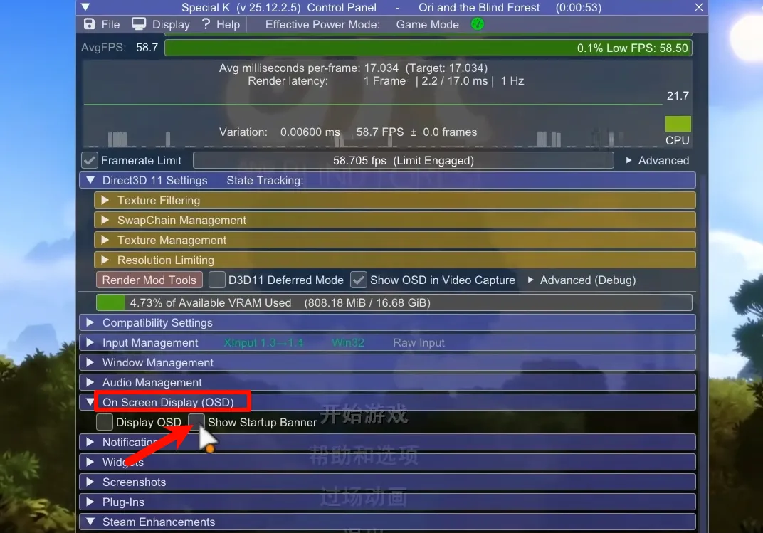 首先是关闭游戏启动时的上方说明文字,只需把On Screen Display下方的Show Startup Banner选项取消勾选就行