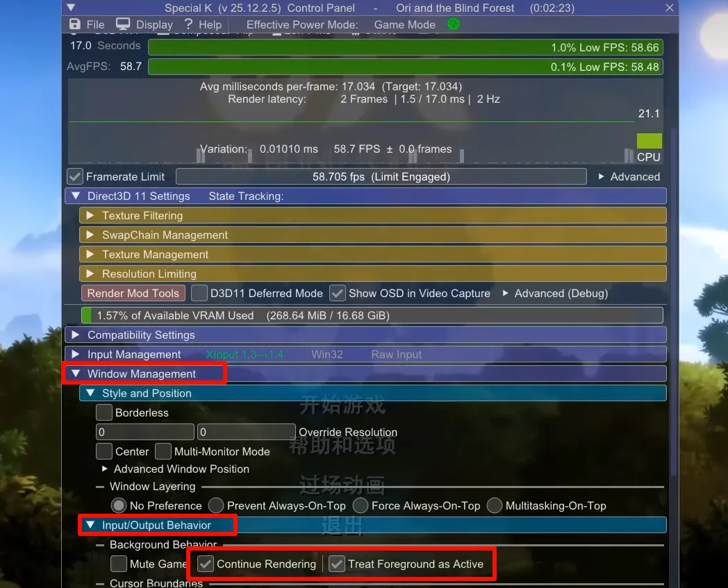 最后就是把Windows Management下Input/Output Behavior里的continue Rendering和Treat Foreground as Active勾选上