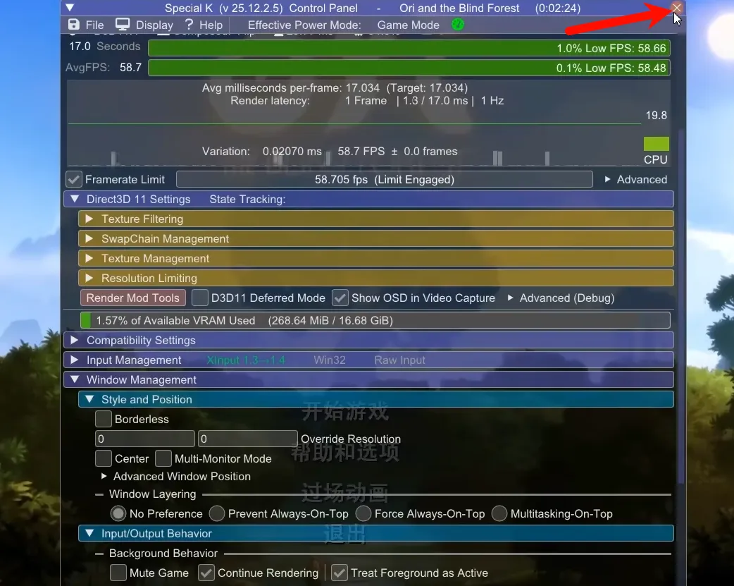 所有设置都选好之后,咱们直接关闭设置界面,所有设置会自动永久保存,以后打开游戏就不用再次设置了