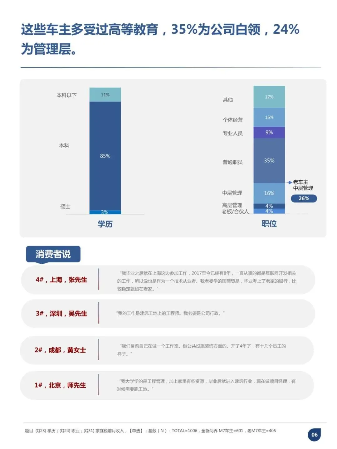 问界M7:车主画像分析报告-尼尔森(附下载)文章摘要问界 M7车主平均年龄33岁,约80%为男性,他们的家庭结构以三口之家为主,孩子多为6岁以下幼童。文章内容文章篇幅有限,仅为部分预览回复暗号:26.问界M7:车主画像分析报告-尼尔森-2026.2-32页*免2023-06-022023年清洁电器行业:618电商投放再升级研究报告(附下载)2023-06-042023年传媒行业:AIGC最新应用与场景研究报告(附下载)2023-06-062023年中国旅行消费趋势洞察白皮书(附下载)2023-06-092023年日本可再生能源电力采购指南研究报告(附下载)2023-06-112023年信息技术业行业白皮书(附下载)2023-06-172023年7月趋势种草指南研究报告(附下载)2023-06-202023下半年宏观经济展望研究报告(附下载)2023-06-242023年度服务地方经济社会发展白皮书(附下载)2023-06-282023年AI崛起,职场变革与人的适配研究报告(附下载)2023-06-29