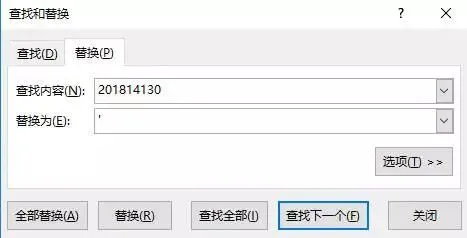 (1)选中数据,Ctrl+F调出替换对话框,查找内容填“201814130”,替换为选项填'(英文的单引号),点击“全部替换”即可;