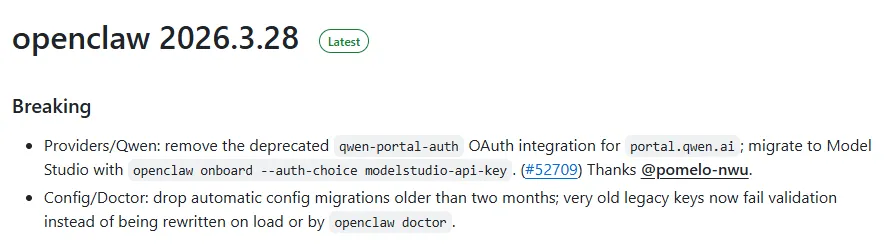 第三步:重点看 Breaking Changes 如果版本说明里标记了 Breaking 两个字,这意味着会有大改。你的现有配置很可能需要手动调整。
