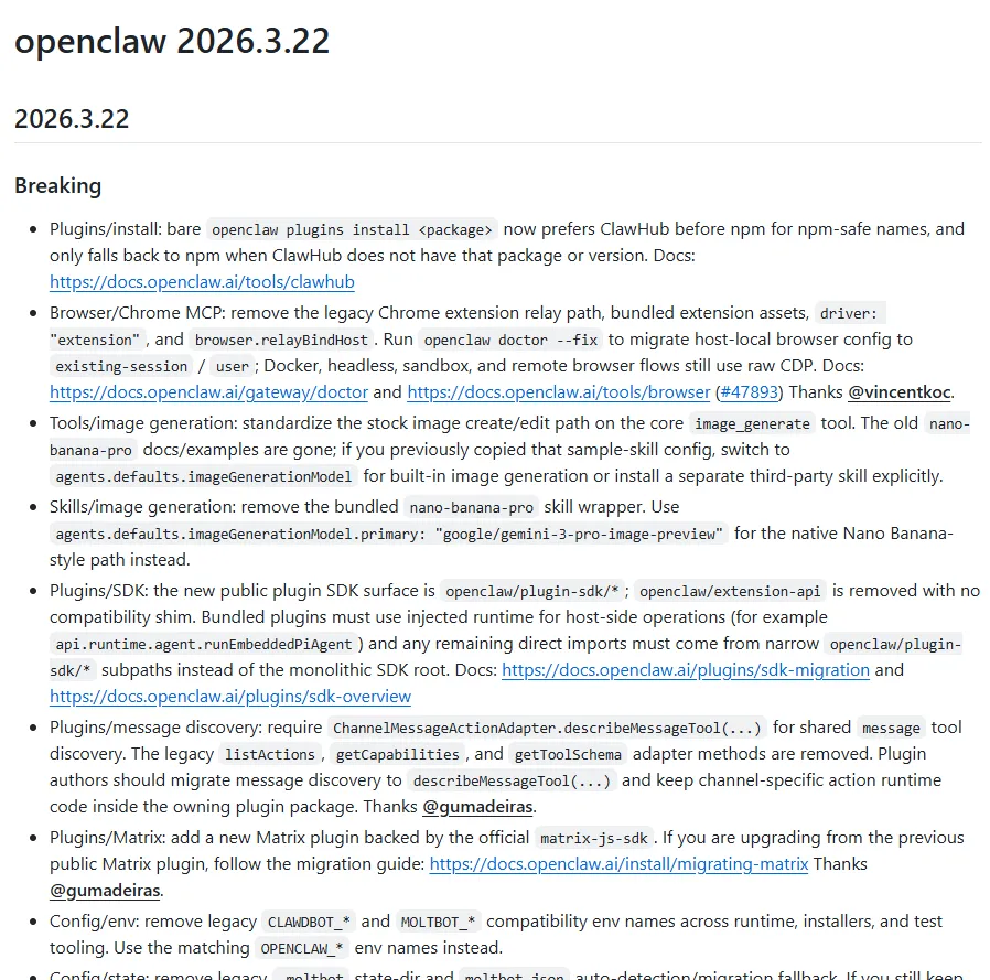 大批用户升级后 Docker 全新安装失败(shared-network namespace 问题) Chrome MCP 被移除,依赖浏览器插件 Relay 的用户升级后功能直接失效 OpenAI Token 认证回滚问题,新保存的 Token 莫名其妙变回旧的 ClawHub 成为默认安装源,部分第三方插件路径改变