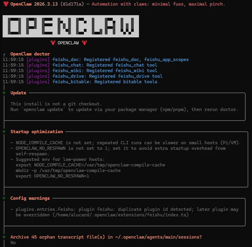 openclaw doctor这会检查你的配置是否正常,Skills 是否能正常加载。
