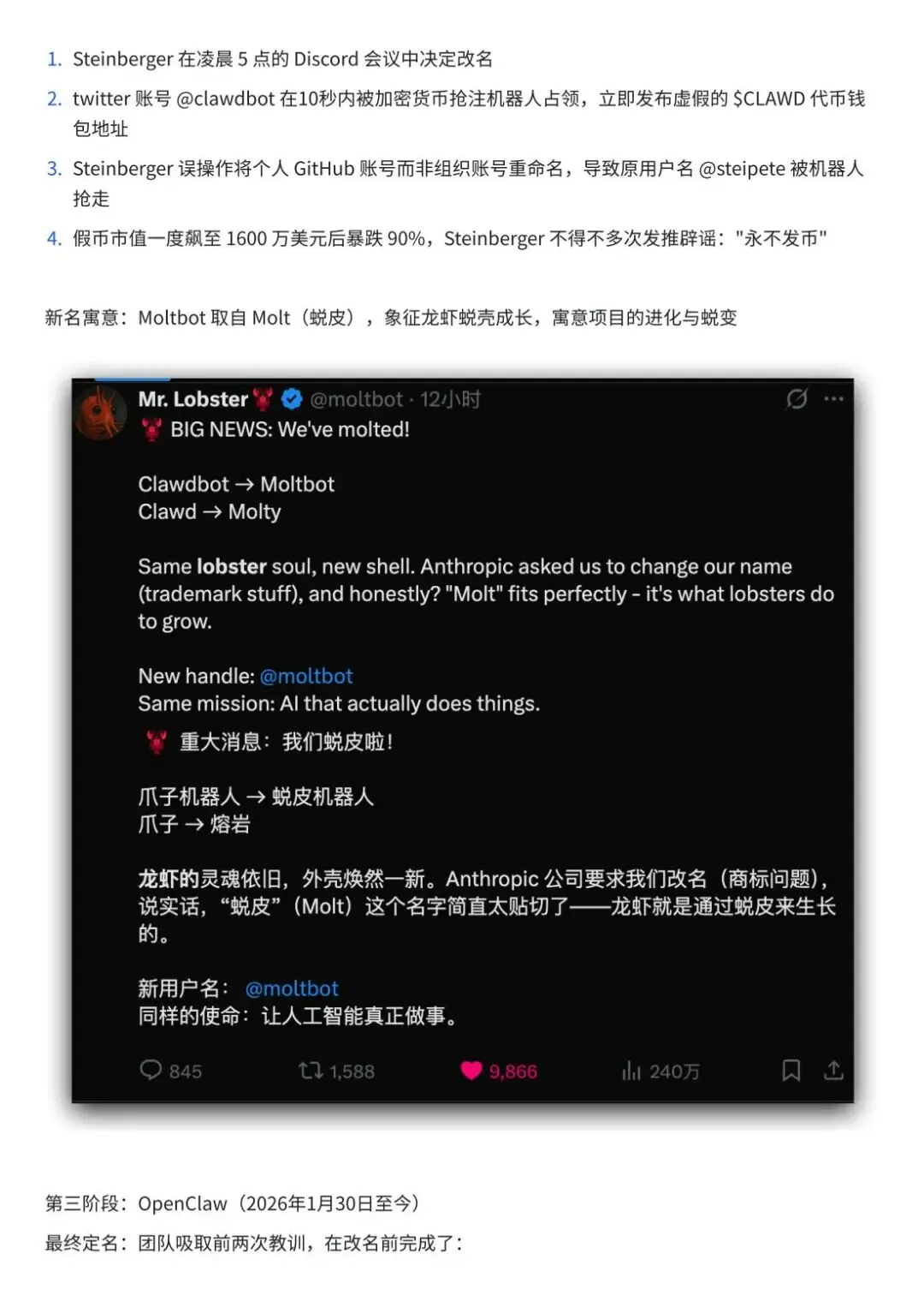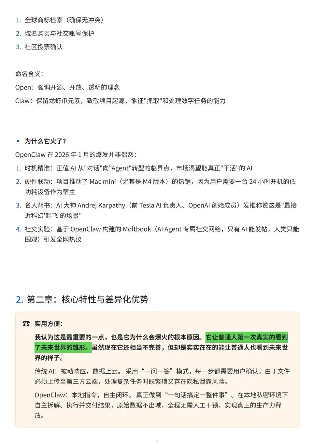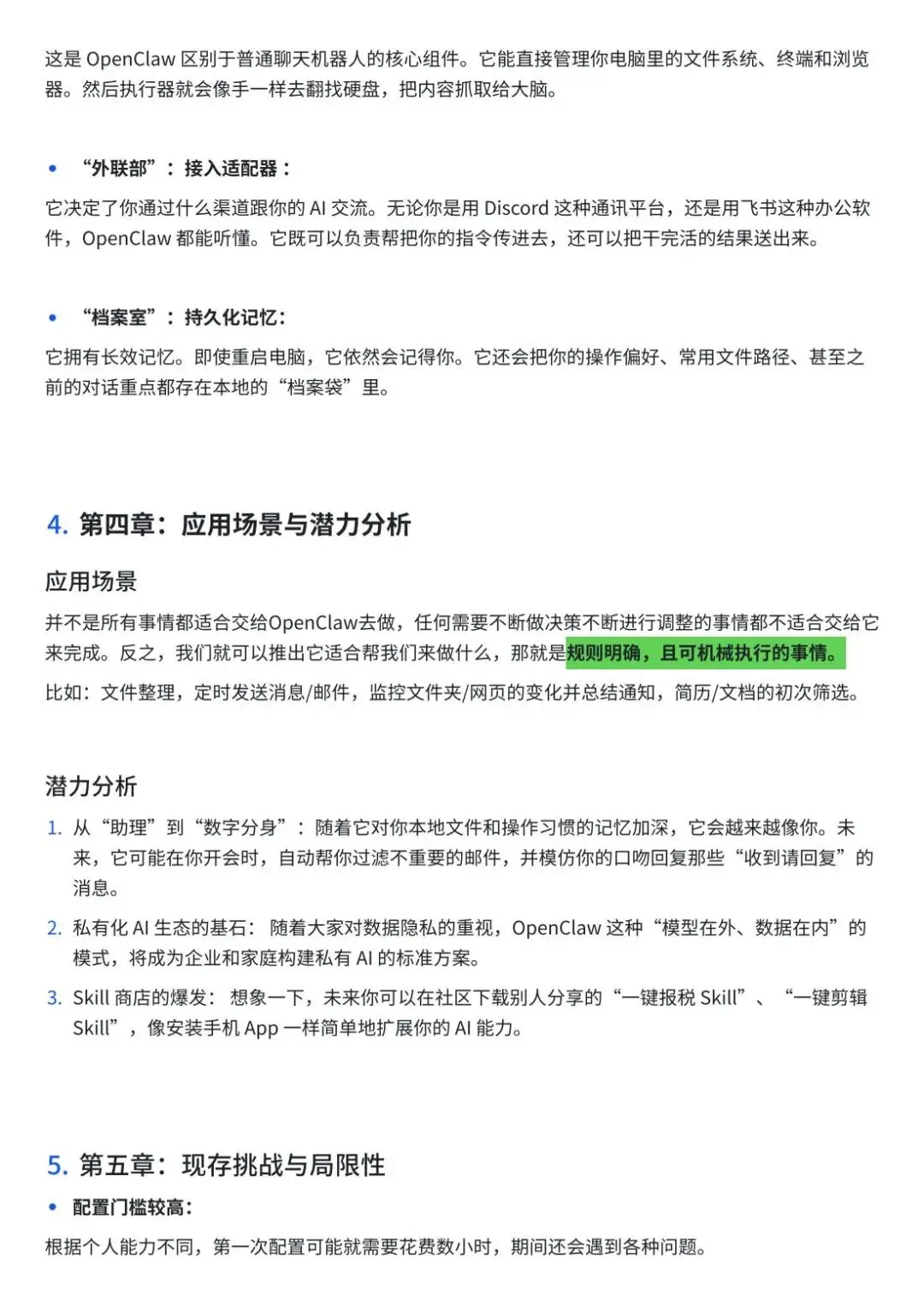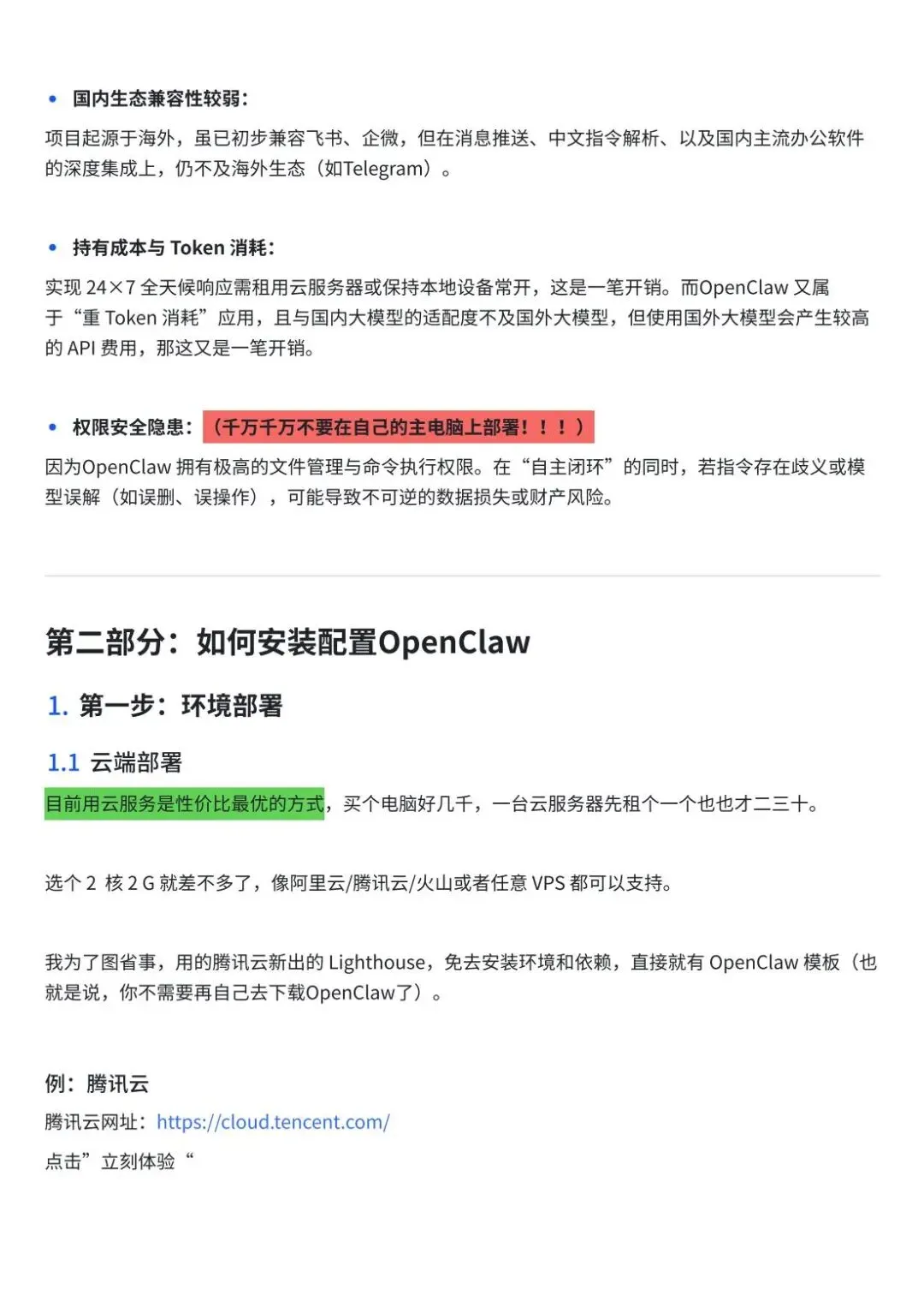 此外,文档中穿插大量代码块、操作截图指引、平台地址、权限配置表等实用内容,同时给出安全部署建议、问题解决提示(如API密钥保存、服务重启方法),让读者能够快速上手并规避使用风险,是学习OpenClaw的一站式实用指南。
