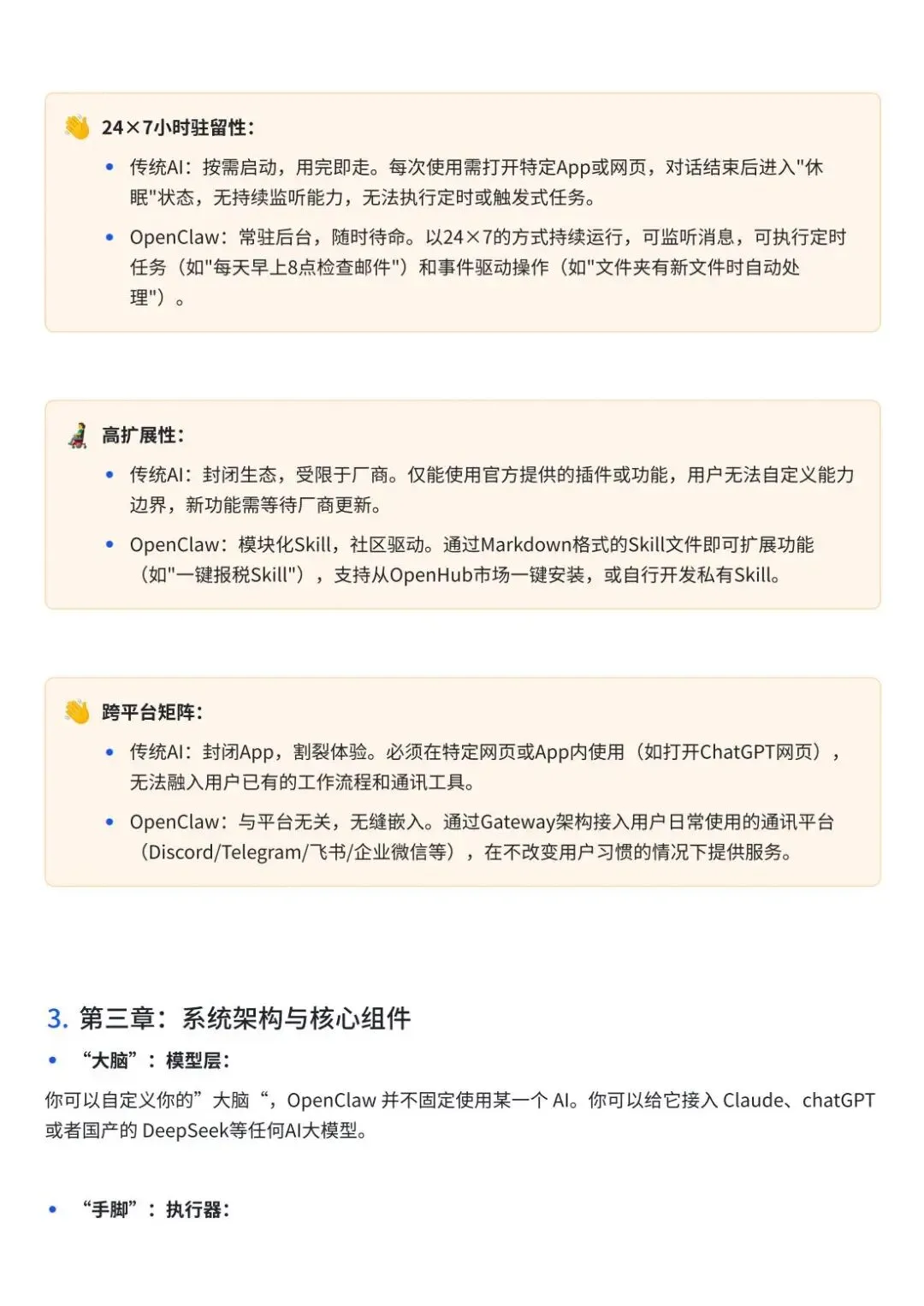 OpenClaw理论知识:为读者搭建基础认知体系,介绍OpenClaw的起源与发展,包括创始人背景、命名变迁史与爆红原因;剖析其核心特性与差异化优势,对比传统AI,突出本地指令、24×7驻留、高扩展性、跨平台矩阵等核心亮点;讲解系统架构的四大核心组件(模型层、执行器、接入适配器、持久化记忆);明确其适用应用场景与潜力方向,同时客观分析当前存在的配置门槛、生态兼容、持有成本、权限安全等挑战与局限性。