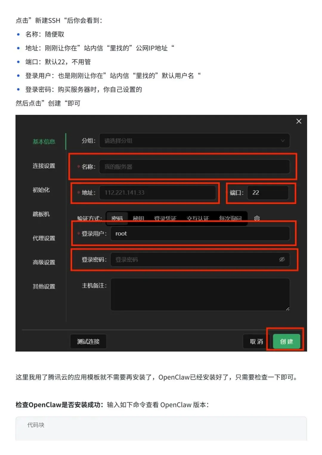 OpenClaw安装配置:这是文档的实操核心部分,提供云端部署和本地部署两种环境部署方案,其中重点讲解腾讯云云端秒级部署(含免费领取云资源教程),并明确本地部署的设备选择与核心命令;详细说明模型配置方法,包括内置API模型(以Kimi 2.5为例)和自定义API模型(以Atlas Cloud、DeepSeek为例)的API获取与配置步骤;以飞书+Kimi2.5、QQ+Kimi2.5、Discord为典型案例,分步讲解Bot配置与OpenClaw的整体配置流程,包含各平台开放平台的应用创建、权限配置、密钥获取,以及服务器端的命令行操作、风险确认、通道选择、技能配置等关键步骤,每一步均搭配具体命令与操作指引。