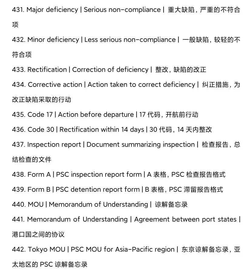 * PSC (Port State Control): 港口国监督检查,由港口国当局对外国籍船舶进行的检查。