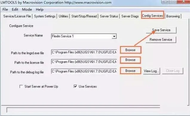 17.在Config Services中点击Browse,分别选择lmgrd.exe,nx7.lic,nx7.log三个文件,点击Save Services。