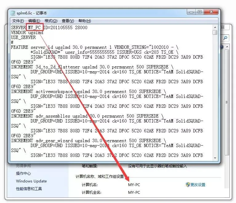 6.用户的计算机名可在计算机属性中查看,将splm6记事本中this-host 替换成你的计算机名,然后保存并退出记事本。