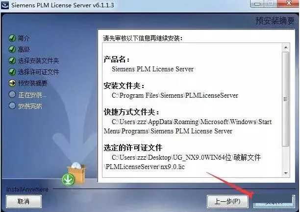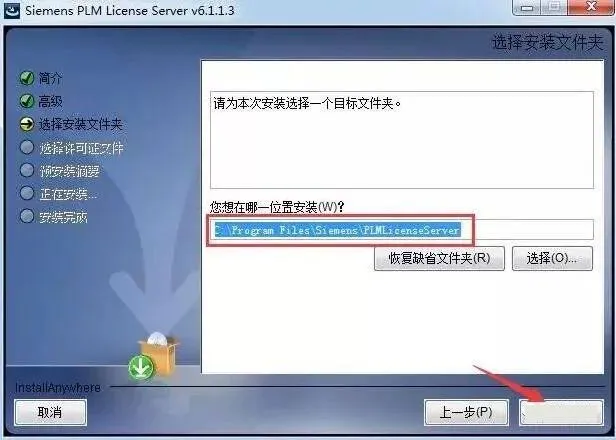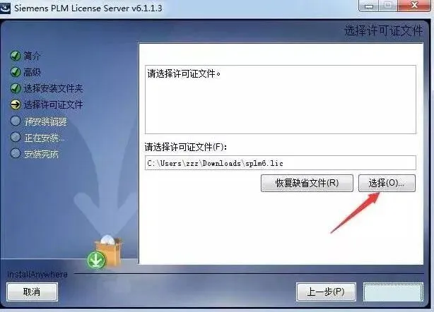11.选择前面修改的许可证文件splm6.lic,点击下一步。