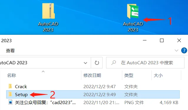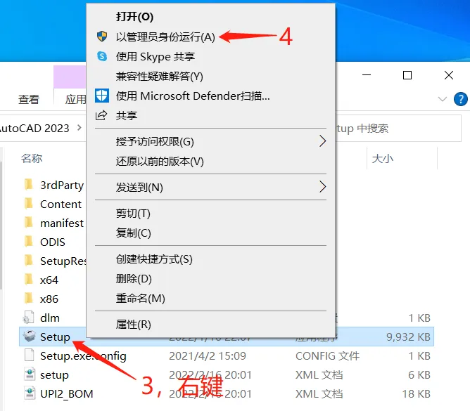 2、打开解压后的文件夹“AutoCAD 2023”,进入“Setup”文件夹,右键Setup,以管理员身份运行(注意这个Setup是倒数第四个)。
