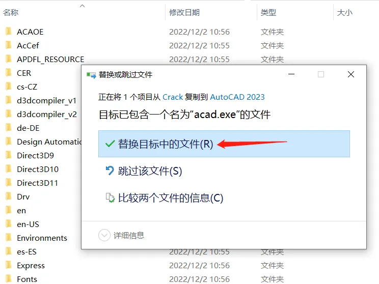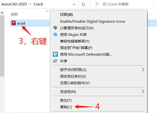 6、打开解压后的文件夹“AutoCAD 2023”,进入“Crack”文件夹,右键acad,复制该文件。