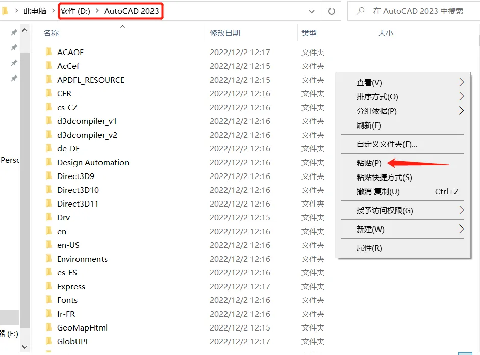 7、打开我们软件的安装位置,如小编的安装位置为:D:\AutoCAD 2023。在空白位置点击鼠标右键,选择粘贴。