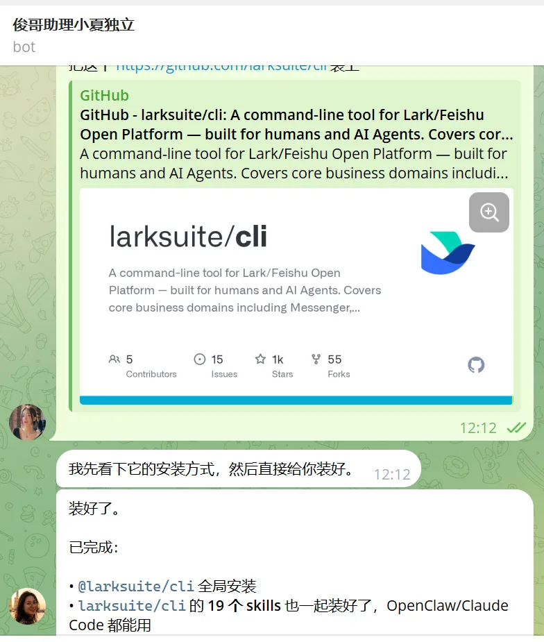npm install -g @larksuite/clinpx skills add larksuite/cli -y -gOpenClaw 自己跑完了。