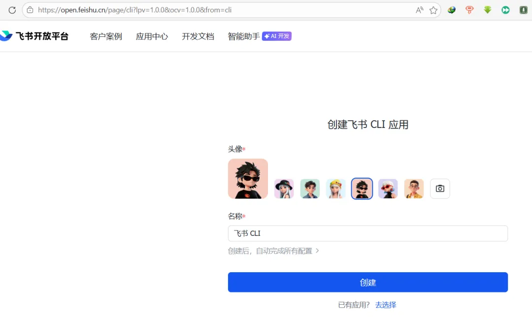 我复制到浏览器,在飞书开放平台上创建了应用,填了名字,点了确认。