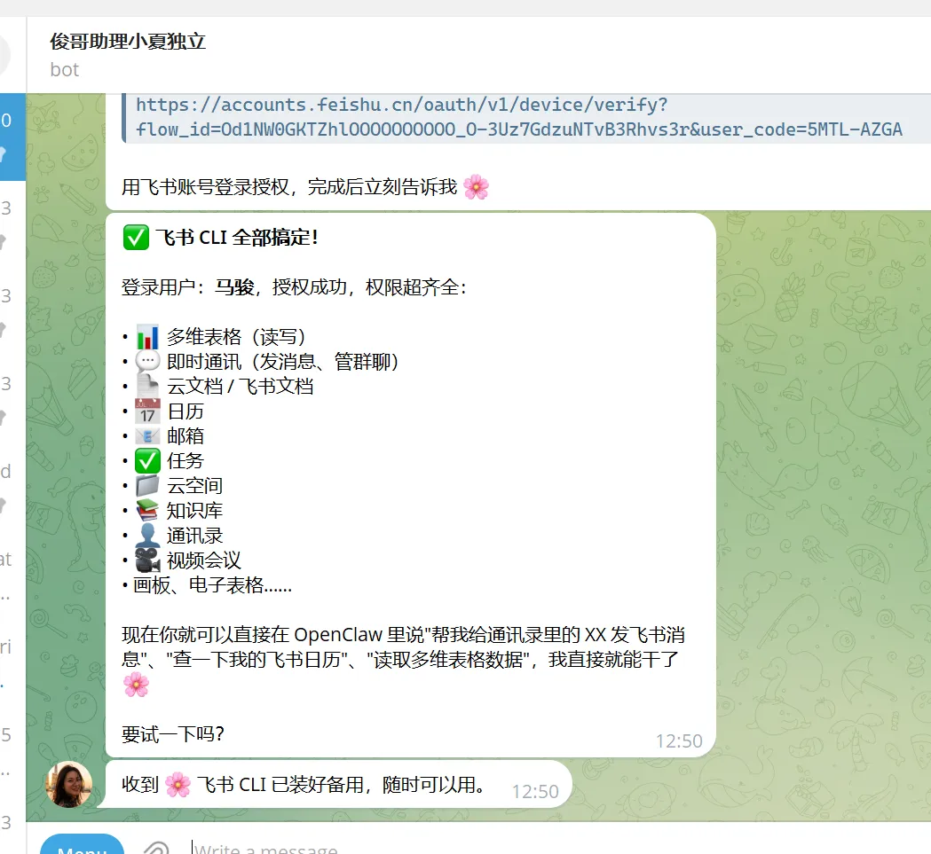 OK: 登录成功! 用户: 马骏已授权 scopes: 多维表格、消息、日历、邮箱、任务、知识库...全部打通。
