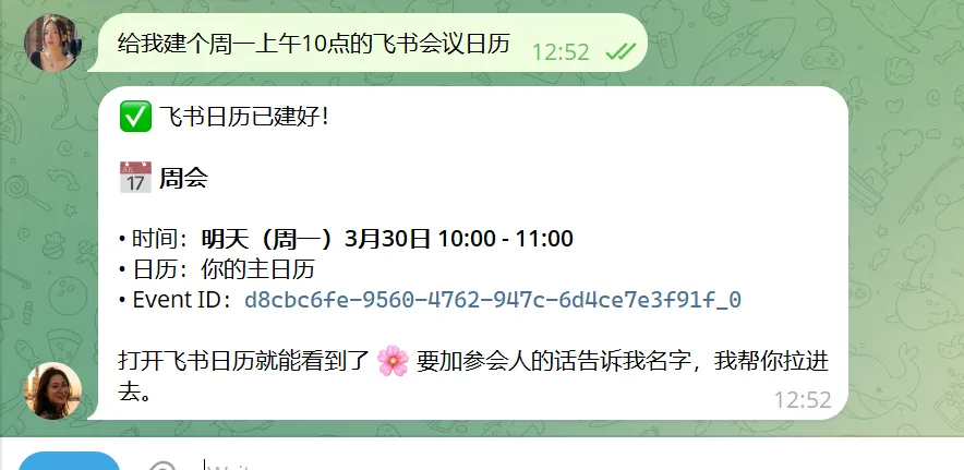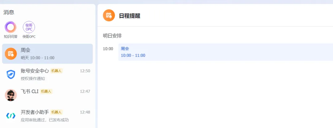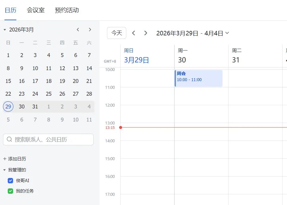{ "ok": true, "data": { "summary": "周会", "start": "2026-03-30T10:00:00+08:00", "end": "2026-03-30T11:00:00+08:00" }}打开飞书,日历里已经有了。