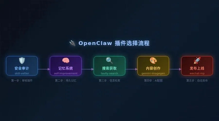 单个插件的价值是1,但正确组合的价值可能是10。self-improving-agent + Memory LanceDB 是记忆组合,wechat-converter + 发布套件是分发组合,gemini-imagegen + brand-visual-generator 是配图组合。