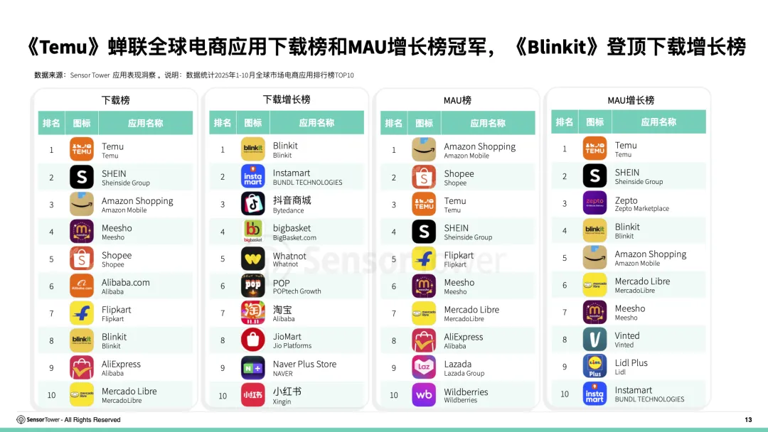 近日,Sensor Tower发布的《2025年购物季电商应用市场洞察》显示,2025年1月至10月,Temu拿下全球电商应用下载榜与月活跃用户增长榜双料冠军。