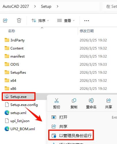 2.打开刚刚解压的文件夹,双击打开“Setup”文件夹,鼠标右键点击“Setup.exe”选择“以管理员身份运行”