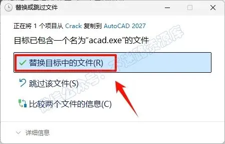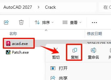 7.返回之前解压的“AutoCAD 2027”文件夹,双击打开“Crack”文件夹,选中“acad.exe”文件,鼠标右键点击“复制”