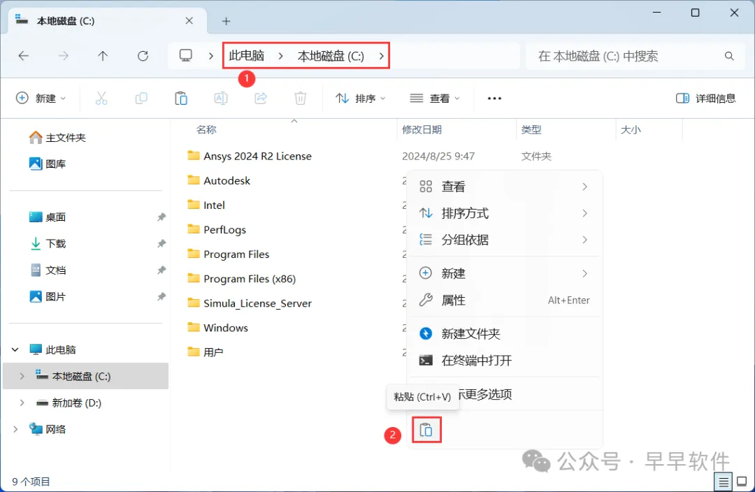 5、打开本地C盘,再右键文件夹的空白处,点击【粘贴按钮】