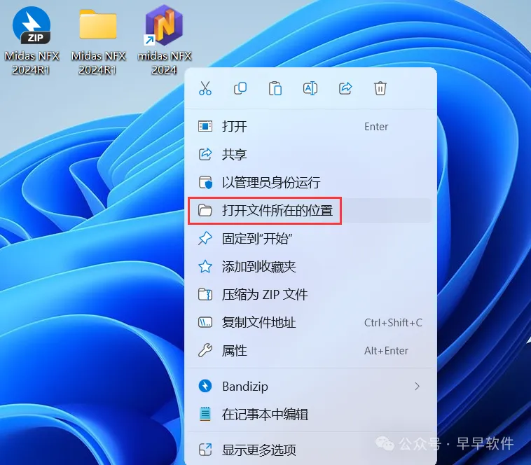 22、回到桌面,右键桌面上的【midas NFX 2024软件图标】,点击【打开文件所在的位置】