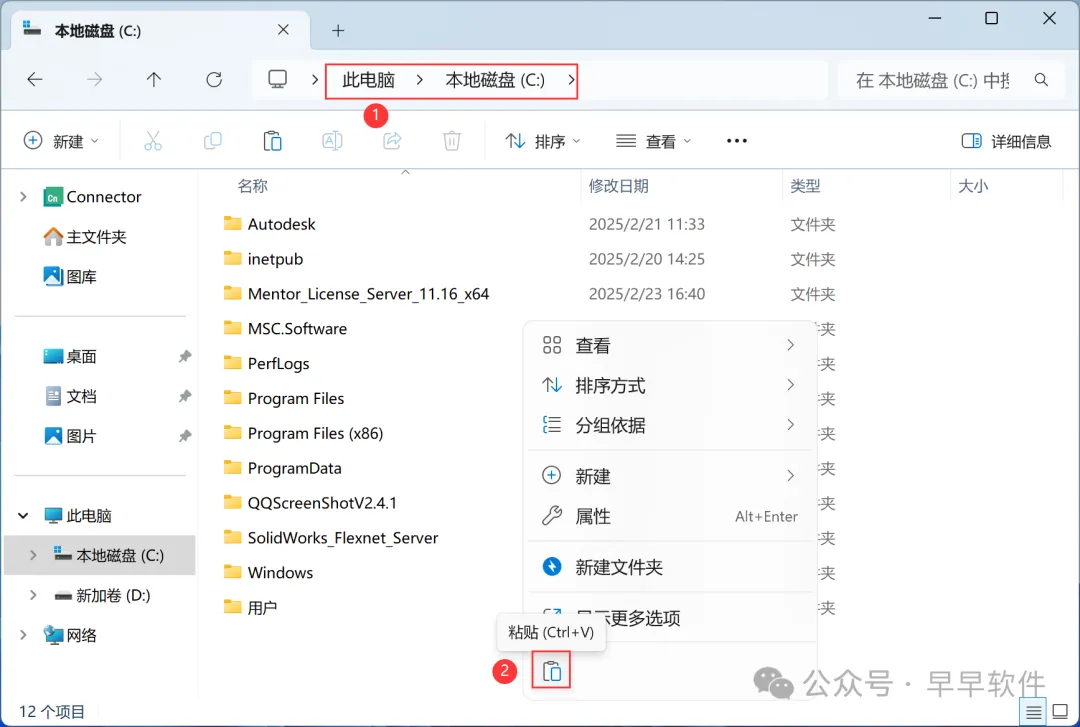 5、打开本地C盘,再右键文件夹的空白处,点击【粘贴按钮】