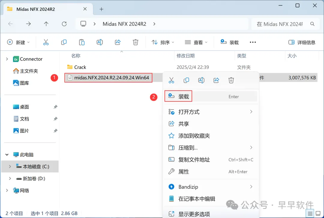 9、回到Midas NFX 2024R2文件夹,找到【midas.NFX.2024.R2.24.09.24.Win64】文件,右键点击【装载】