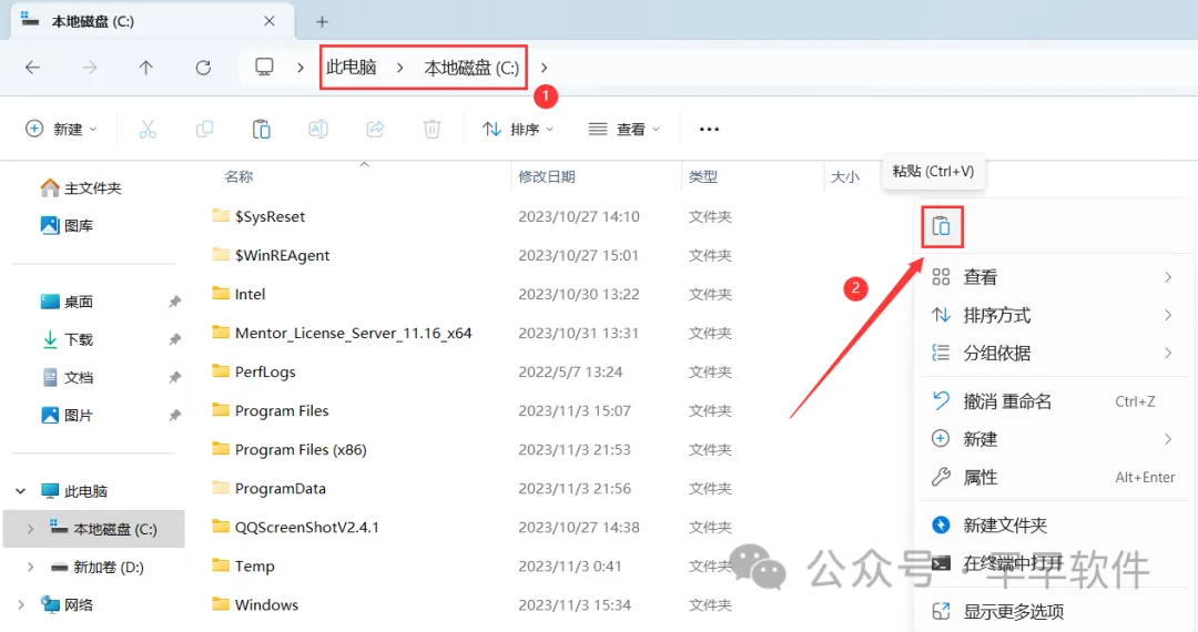 17、打开本地C盘,再右键文件夹的空白处,点击【粘贴按钮】