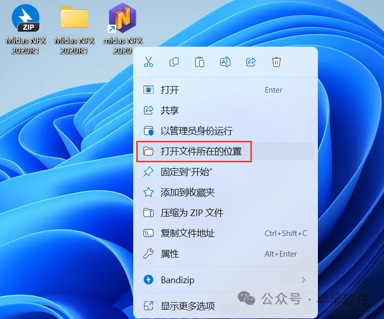 23、回到桌面,右键桌面上的【midas NFX 2020软件图标】,点击【打开文件所在的位置】