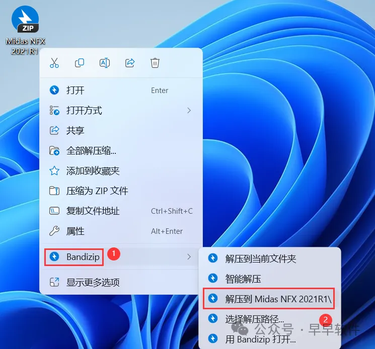 1、下载Midas NFX 2021R1软件安装包到电脑上,右键选择【解压到Midas NFX 2021R1\】