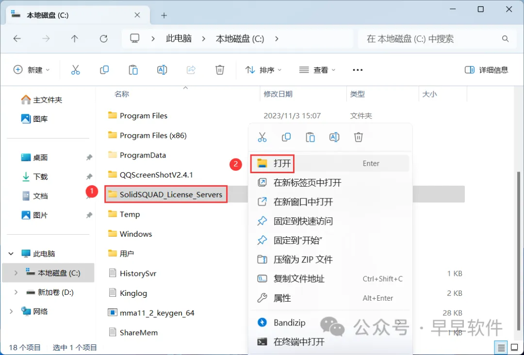 19、找到粘贴的【SolidSQUAD_License_Servers】文件夹,右键【打开】它
