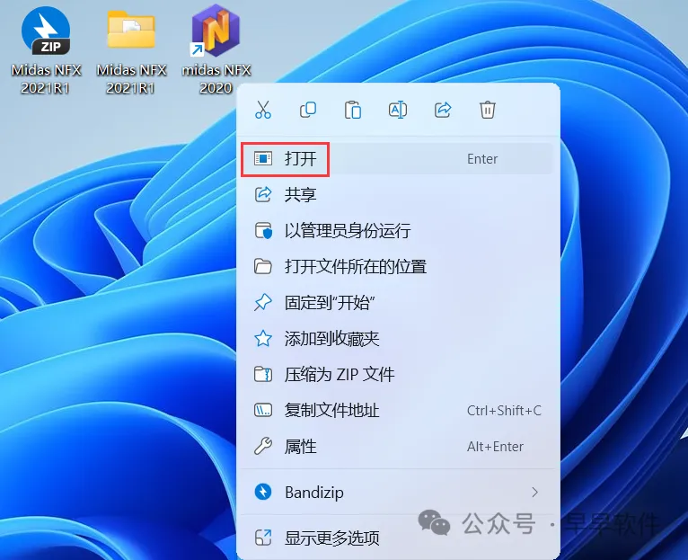 33、回到桌面,右键桌面上的【midas NFX 2021软件图标】,点击【打开】