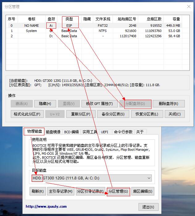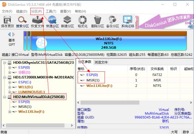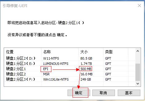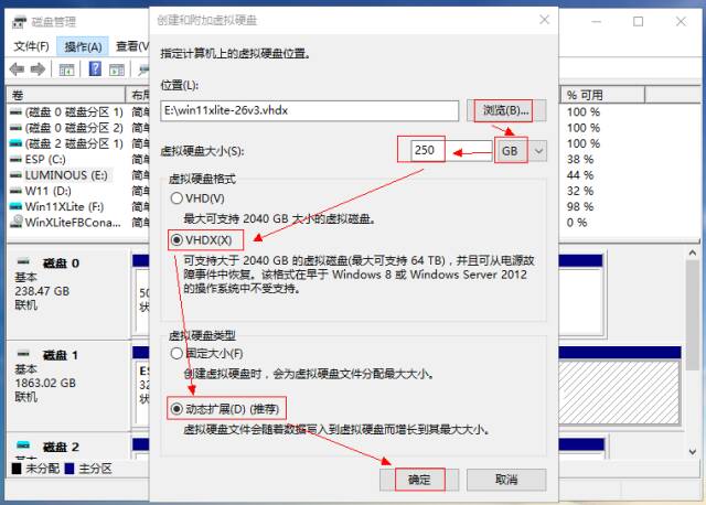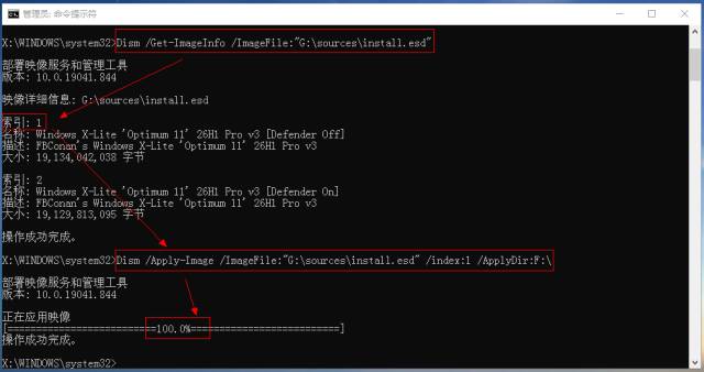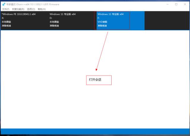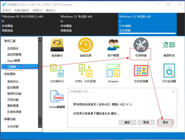 1.电脑关机状态, 进入BIOS ,确认当前主板设置是Legacy还是UEFI状态,若确认是UEFI直接跳到第五部分;若是Legacy或找不到(u)EFI字样,接着往下看, 2.继续在主板BIOS里设置启动顺序,将U盘启动设置为第一位。 4.在WePe环境下,运行 桌面的DiskGenius,选中带有系统的硬盘,右键“ 转换分区表类型为GUID格式 ”,参考: 转换为GPT磁盘 5.至此,基本确定主板BIOS是传统Legacy,须部署UEFI模拟环境: 确认已将Clover之分区ESP所需文件复制到本地电脑ESP分区 c.部署云固件,从微信公众号“云固件”下载最新正式版,或扫码下方二维码: DiskGenius界面, 将云固件主程序包里的最少 两个 文件夹 Drivers和MW(通常会带上Icons)拖入本地磁盘的ESP分区的EFI目录: d.默认加载云固件:将/EFI/MW/MW.efi复制到/EFI/ CLOVER/,并改名为 CLOVERX64.efi, WePE环境, Windows自带磁盘管理,选择任意磁盘,操作,创建vhdx磁盘 磁盘管理器窗口新增一块虚拟磁盘,选中右键, 初始化为GPT磁盘。 a.WePE环境,D iskGenius给虚拟磁盘新建ESP(500MB)*MSR分区 b.回到Windows自带磁盘管理窗口,将虚拟磁盘剩余空间新建为NTFS分区 a.WePE环境,文件管理器找到U盘或硬盘中的Windows安装镜像,右键加载,此时会看到新增一个虚拟光驱,记下盘符,比如 “G:\ ”。 b.命令提示符,右键,以管理员身份运行,输入以下命令并回车: Dism /Get-ImageInfo /ImageFile:"G:\sources\install.wim" Dism /Apply-Image / ImageFile :"G:\sources\install.wim" /index:1 / ApplyDir :F :\上述索引为操作系统版本,如家庭版,企业版,旗舰版,F:为虚拟磁盘的NTFS分区