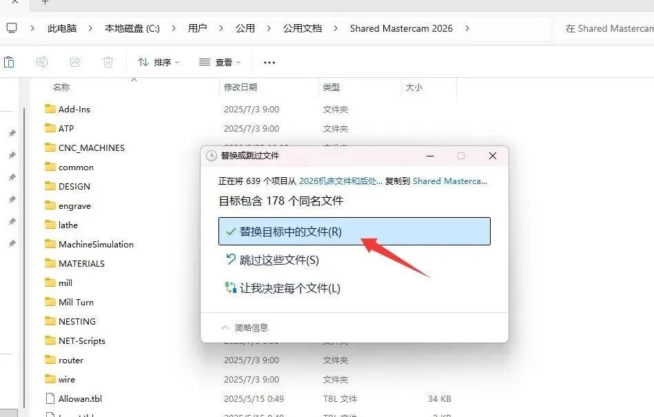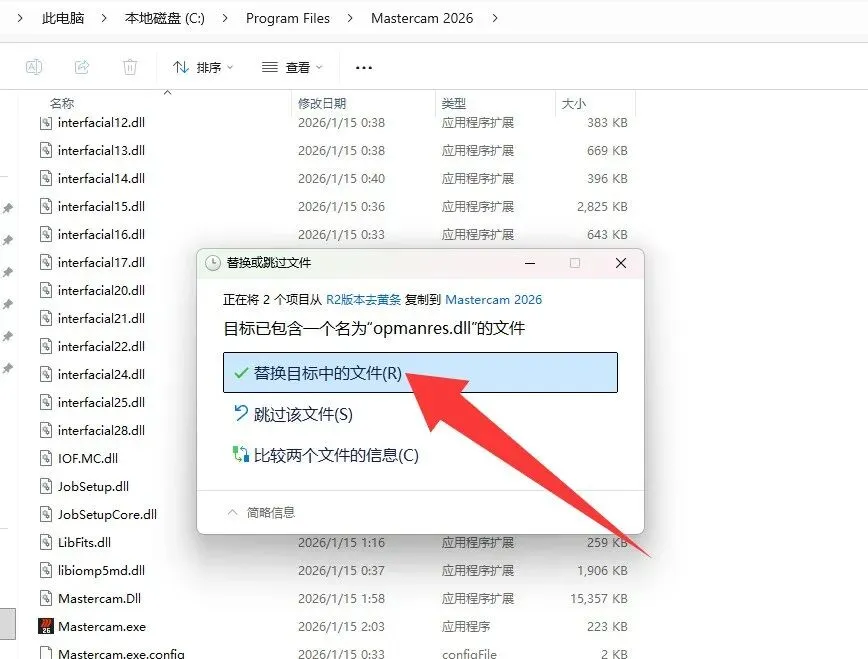 15、在Mastercam 2026R2安装路径下粘贴前面复制的文件,选择替换目标中的文件。