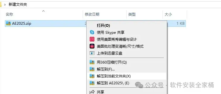 1、打开下载的AE2025软件安装包,鼠标右击压缩包选择【解压到当前文件夹】。