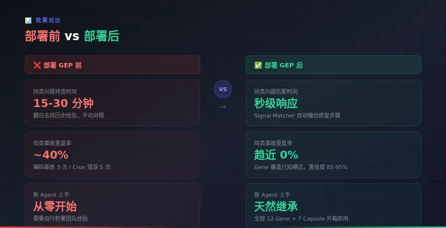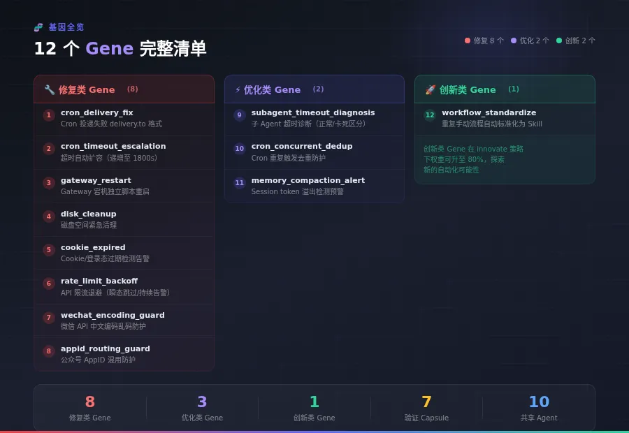 事后补救效率极低。最好的方式是:每次解决一个非平凡问题后,立刻把修复逻辑沉淀为一个 Gene。让这个 Gene 成为下一个遇到同样问题的 Agent 的"第一个提示"。