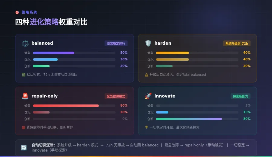 • 骨架:EvoMap 的 GEP 格式 + 策略预设
