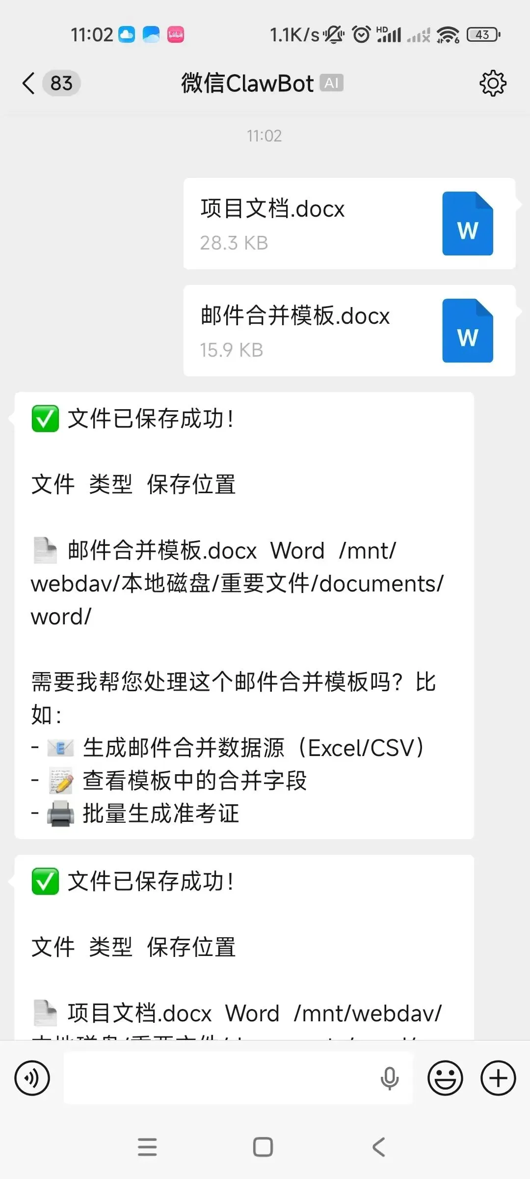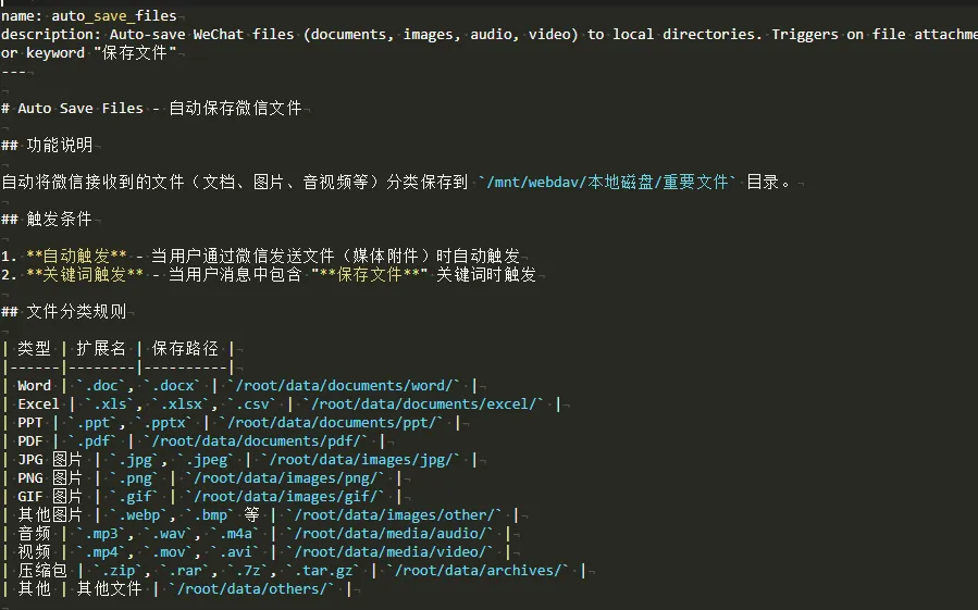 因此,我们需要给其开发一项技能。当我发送文件给微信ClowBot他会自动保存文件到我本地NAS并进行文件分类。先来看看实际效果!