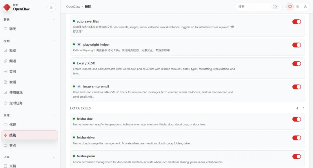 脚本完成后,可以重启Gateway,技能自动注册。
