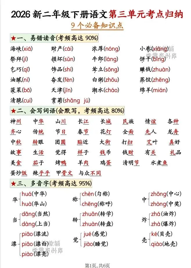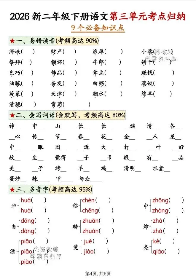 今天给大家整理了2026新二年级下册语文第三单元考点归纳+空白,转发给朋友或班级群,受益更多人,帮助孩子学习!